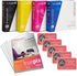 Tintas Sawgrass SubliJet UHD SG500 y SG1000 (paquete de 4) con 100 hojas de papel de sublimación y diseños en cian, amarillo, magenta y negro.